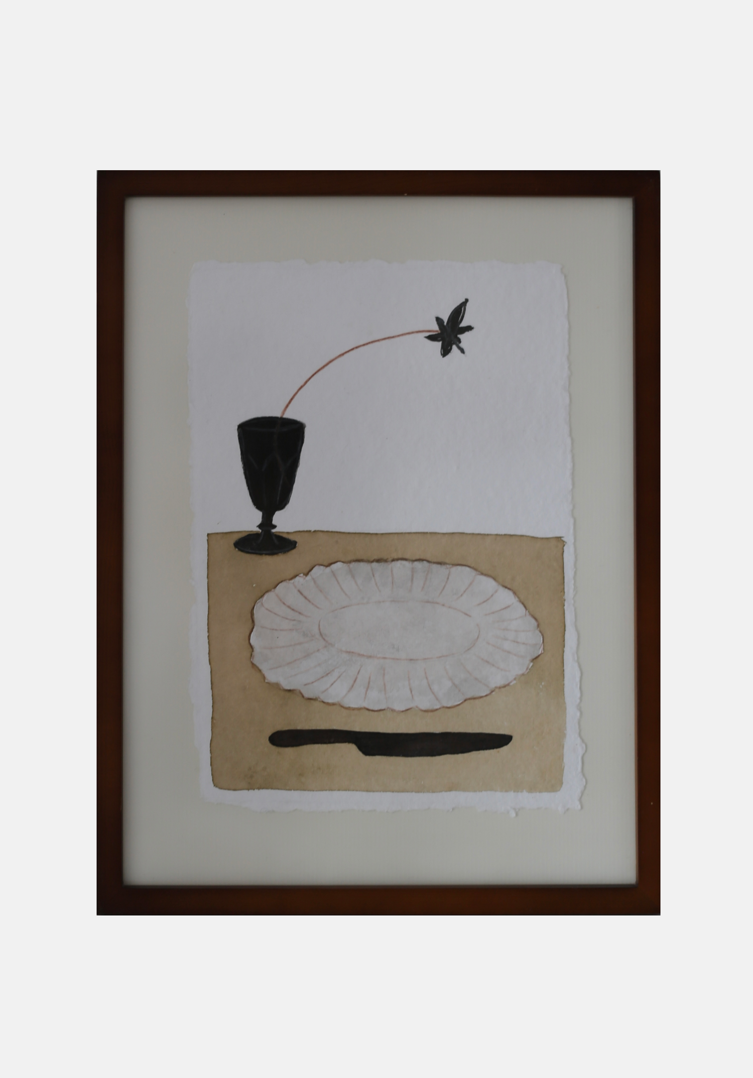A collection of quiet scenes painted in ink and pencil on cotton paper – table settings, vases, and imagined spaces, all drawn from memory, daydreams, and places I hold dear.