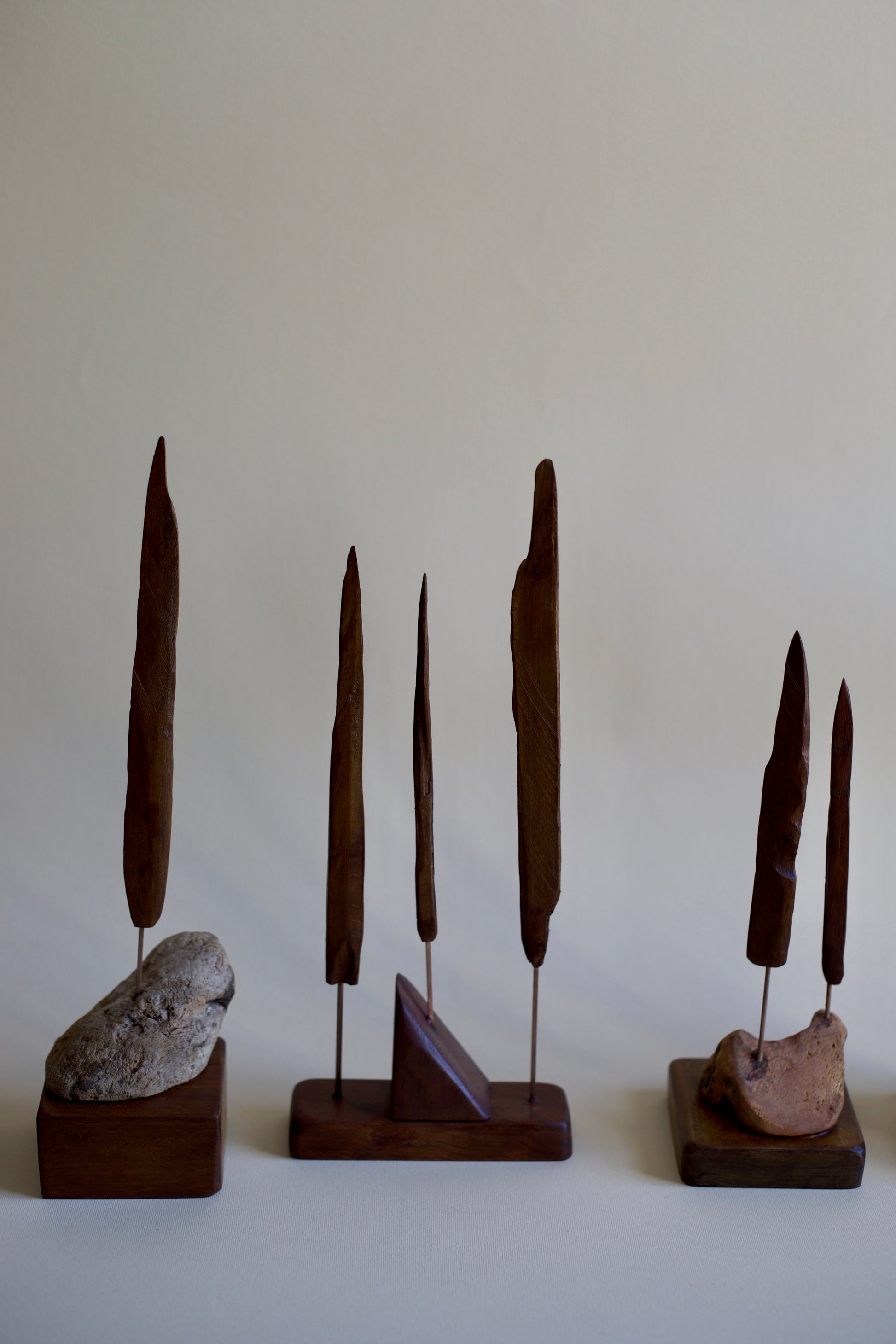 Each piece is crafted from reclaimed woods such as mahogany, teak, jatoba, and pine. The trunks are made of copper, and the sculptures are accented with stones, blending organic materials with a sense of timeless artistry.