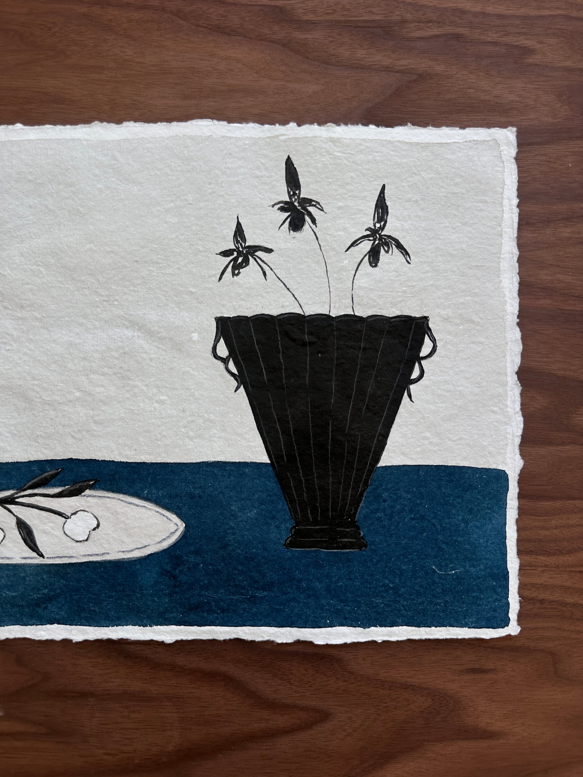 Another still-life composition from the navy blue series, featuring a vase of wild orchids alongside a plate of cherries.