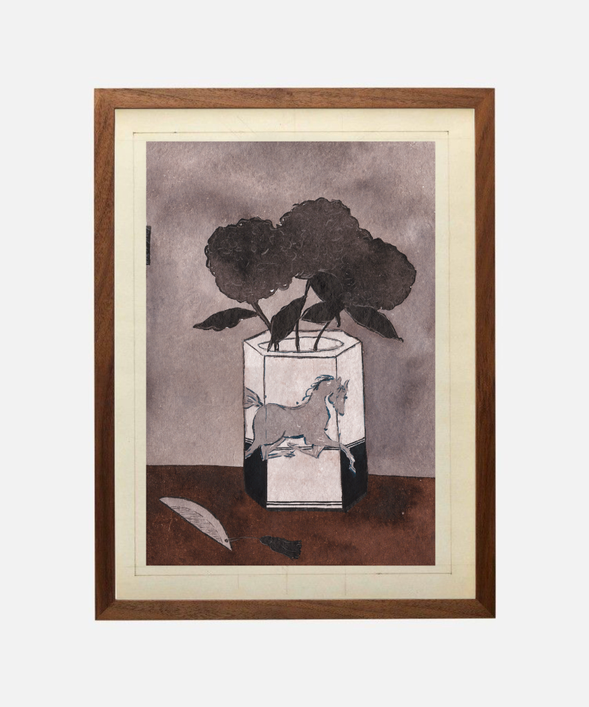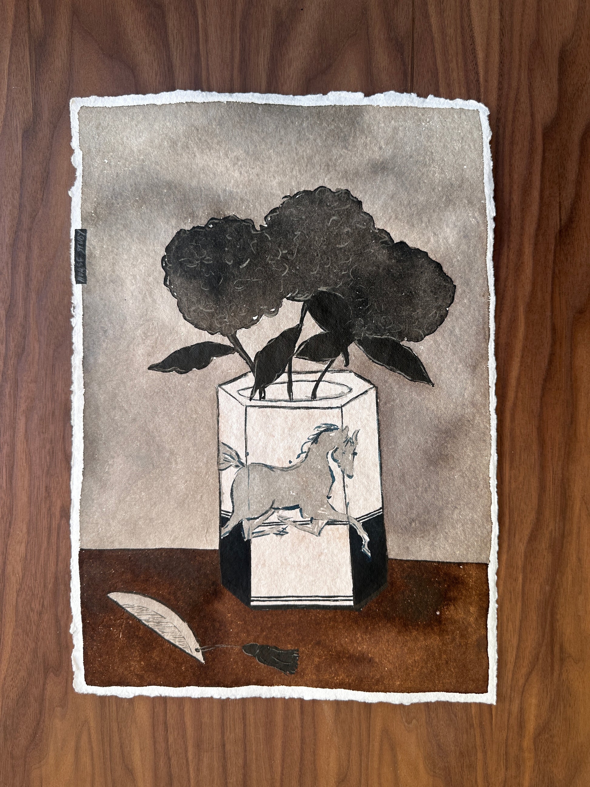 These series are inspired by the Year of the Horse, recent trips to Asia, and my childhood memories of growing up in the countryside, surrounded by these beautiful animals. Other natural motifs often find their way into the paintings too, like hydrangeas.