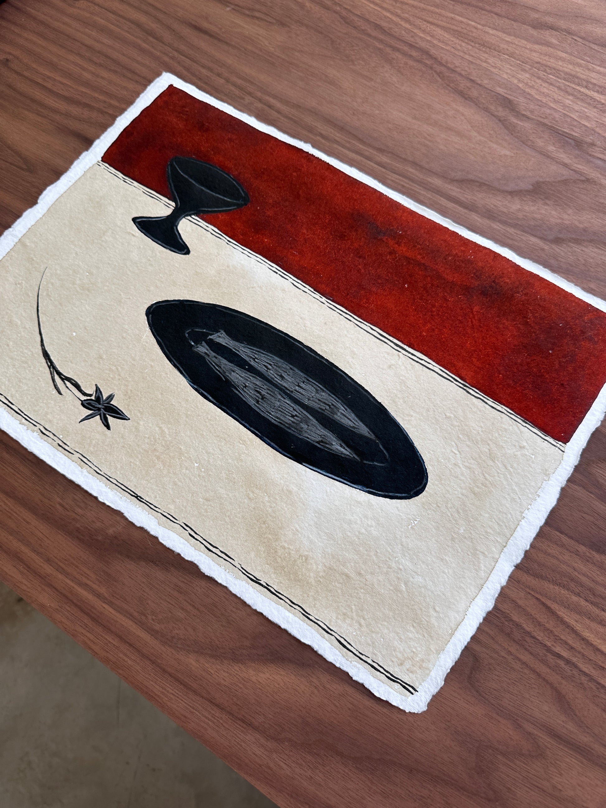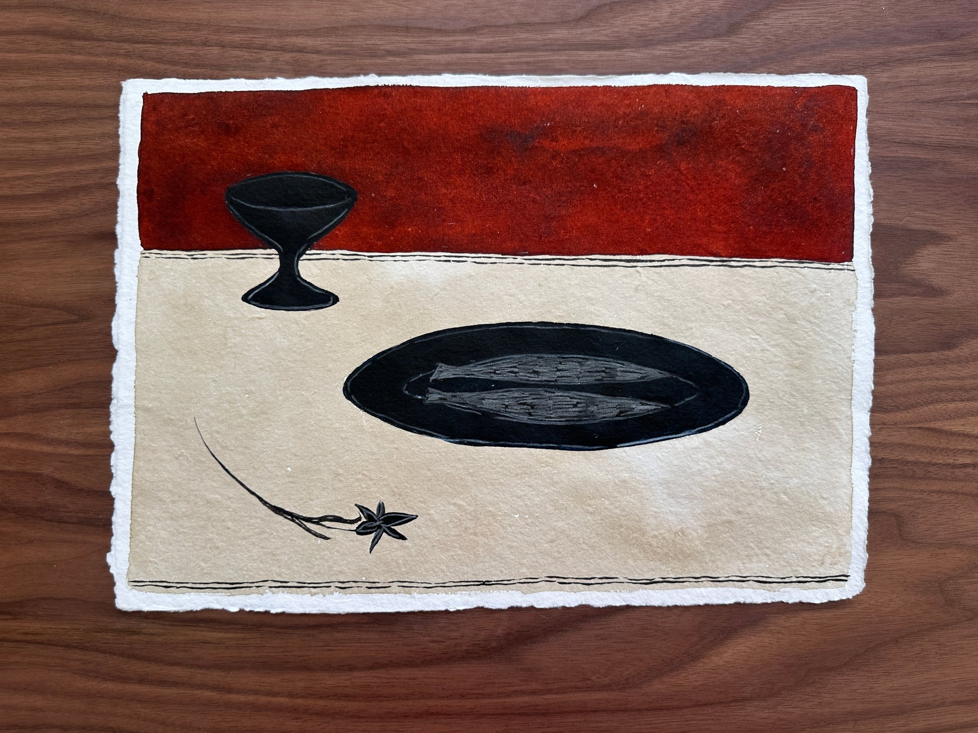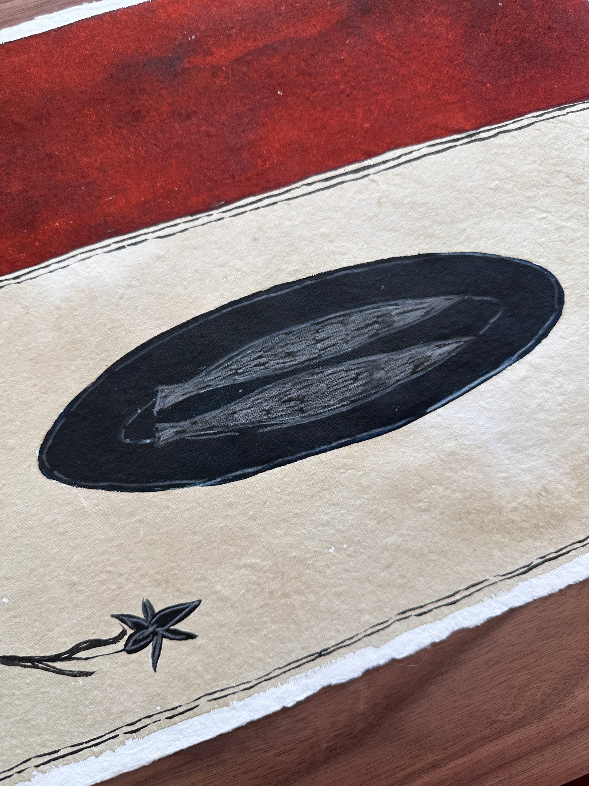 A recurring subject for the artist, featuring symbols that are closely connected to her: sardines, an element found in her father’s oil paintings, and a delicate orchid that now feels like a signature - a subtle wink. This time, the work is set in deep red tones.