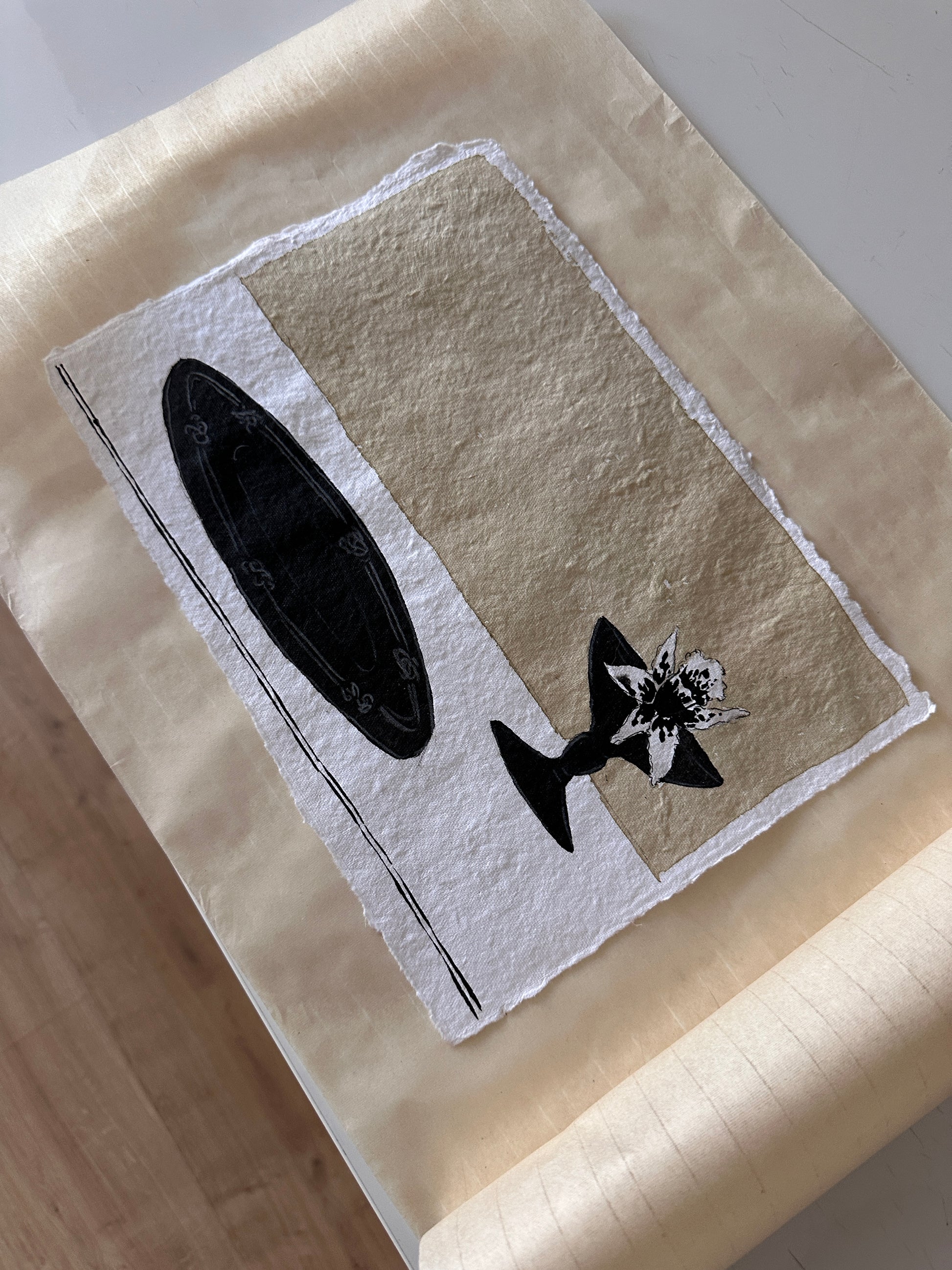 A delicate piece depicting a table setting, with a sketched plate and glass accompanied by an orchid. This is one of my favourites, part of my personal collection, but I’m offering it now in the hope that someone else will cherish it as much as I do.